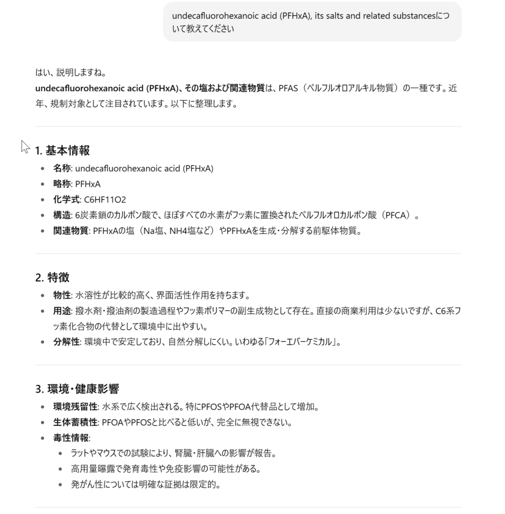 ChatGPT 5にundecafluorohexanoic acid (PFHxA), its salts and related substancesについて質問する