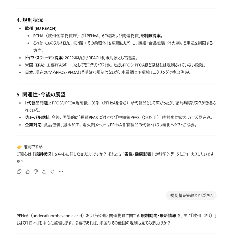 最近の急激な生成AIの進化は、化学物質規制情報入手においても非常に役に立ちます。