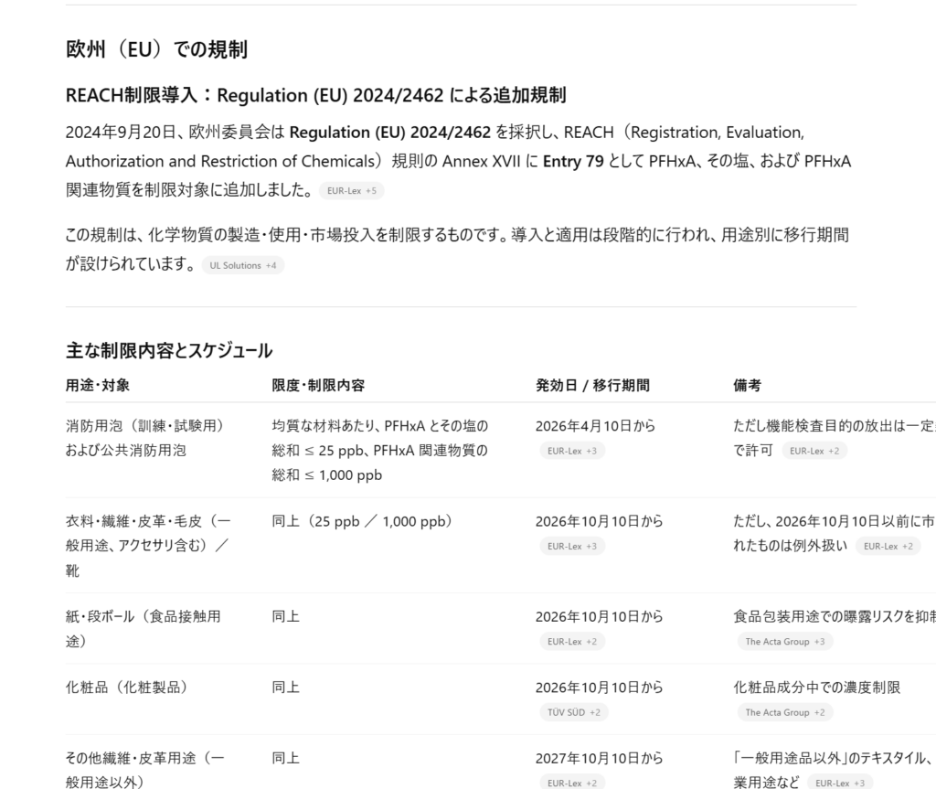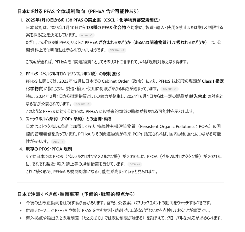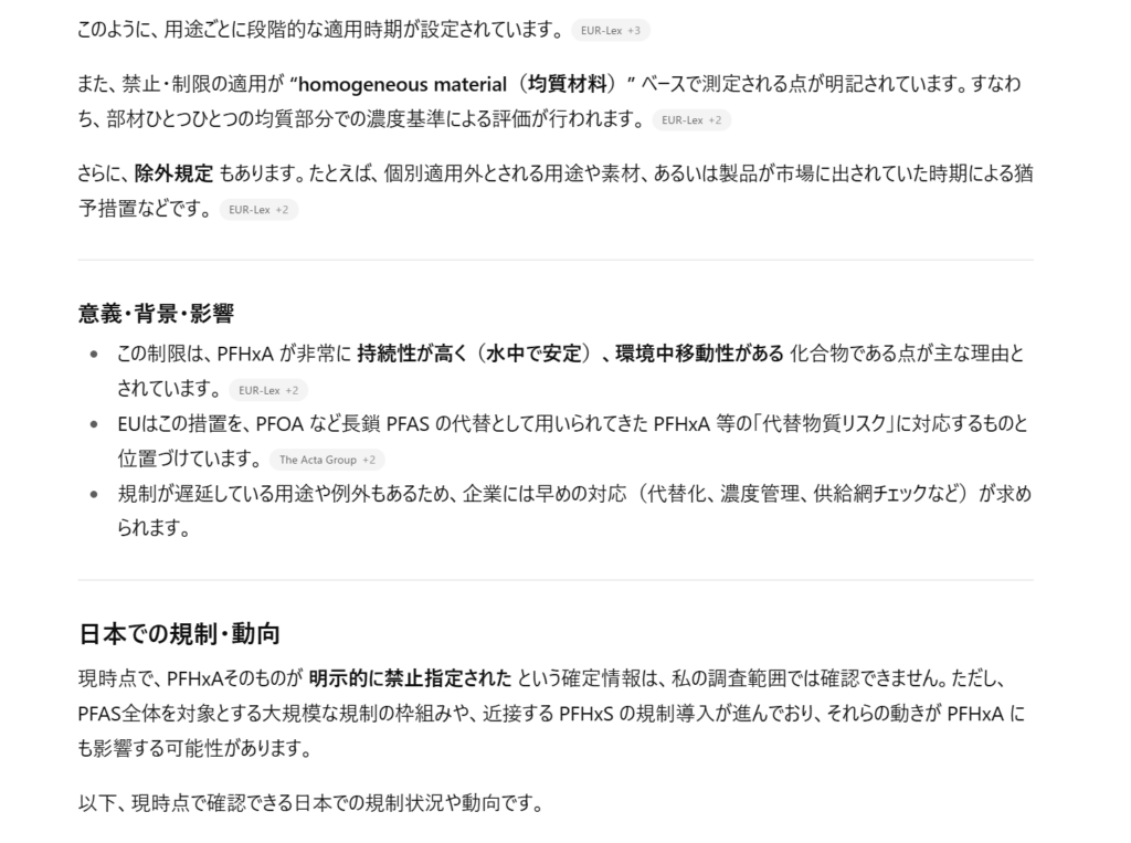 ある規制に向かっている方向性や、規制に対してどのように考えるべきか、行動すべきかというような実務上の問題や、chemSHERPAなどの実際のツールの使い方、世の中どういう方向に向かっているかの考察などは、未だに記事として有用かもしれませんが、単なる規制の事実に関して調べ物をする場合、生成AIを使ったほうが早くて正確な世の中になっていきそうです。